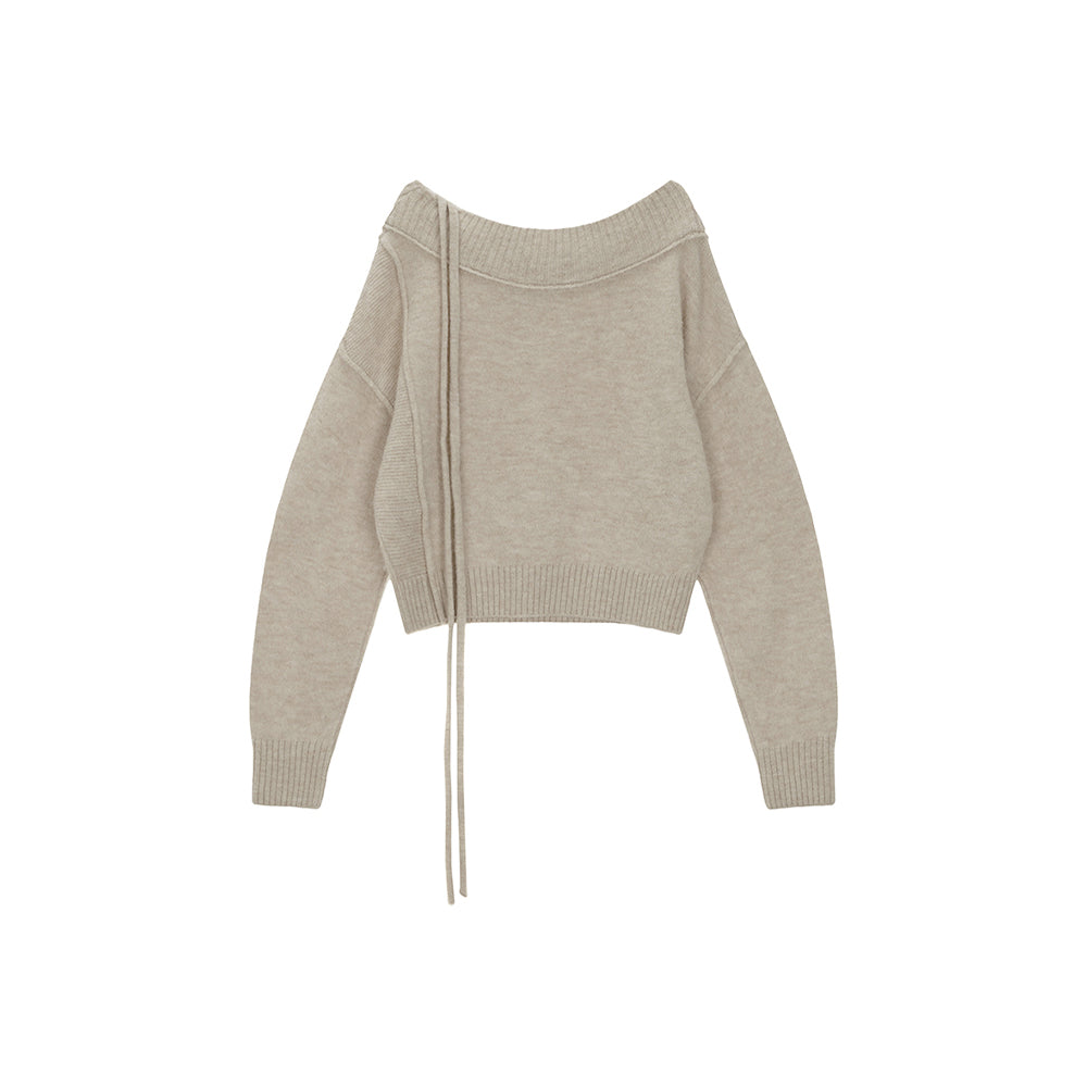 OFF SHOULDER STRING KNIT PULLOVER IN BEIGE