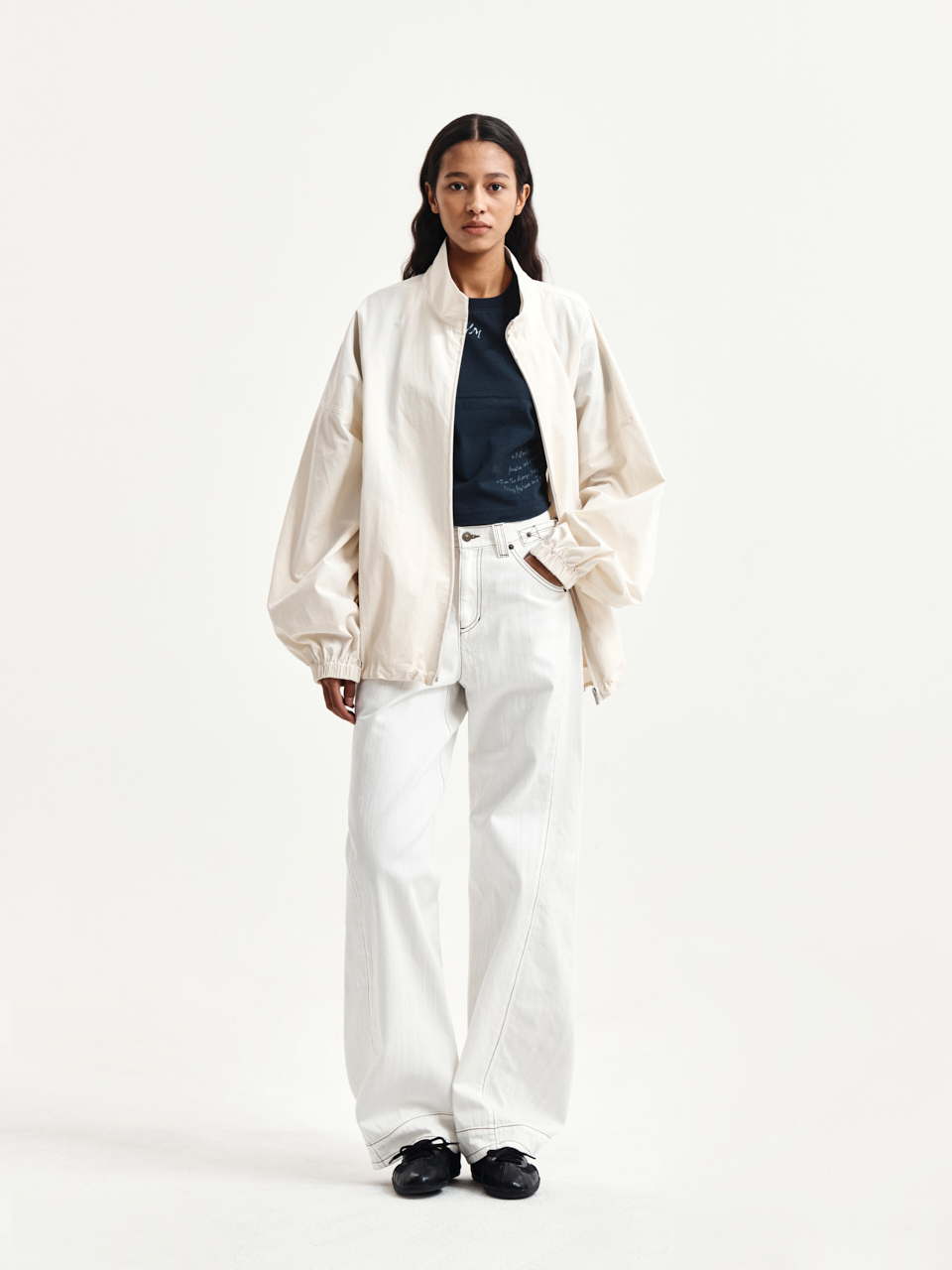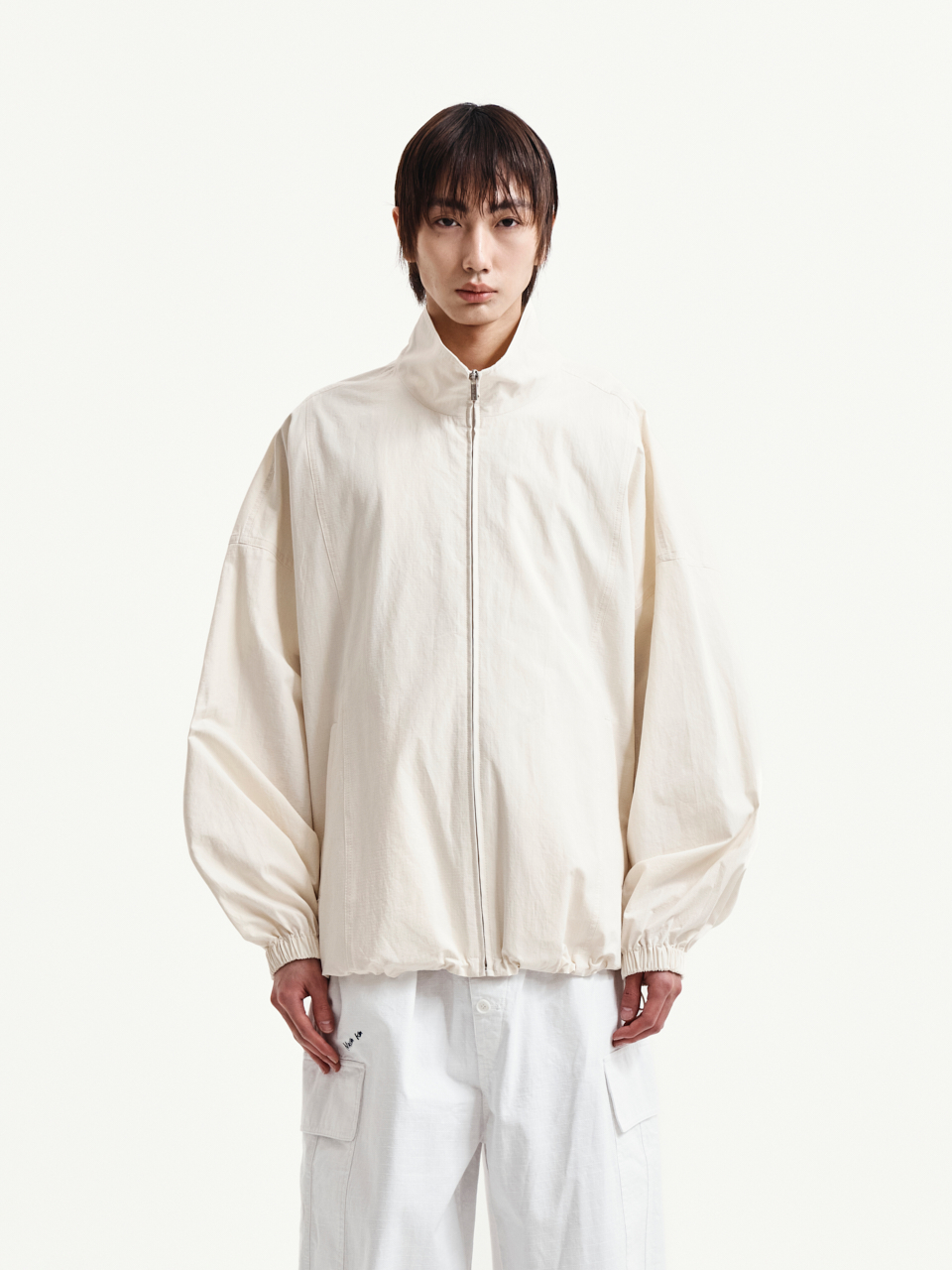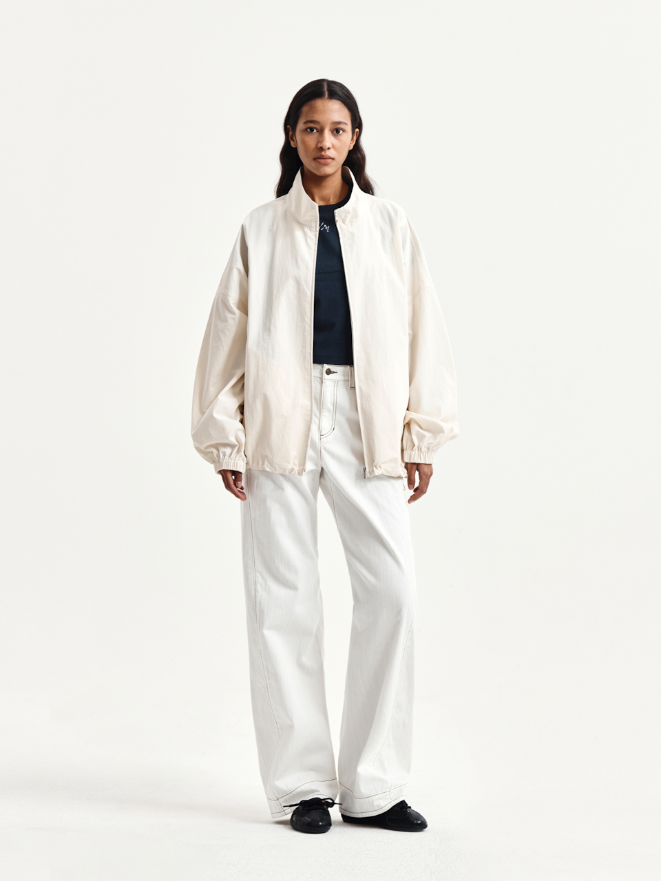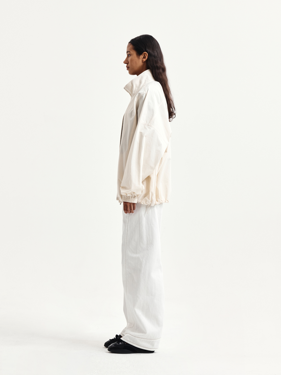 A high-neck oversized zip-up made from soft cotton, featuring logo accents on the front and back panels.