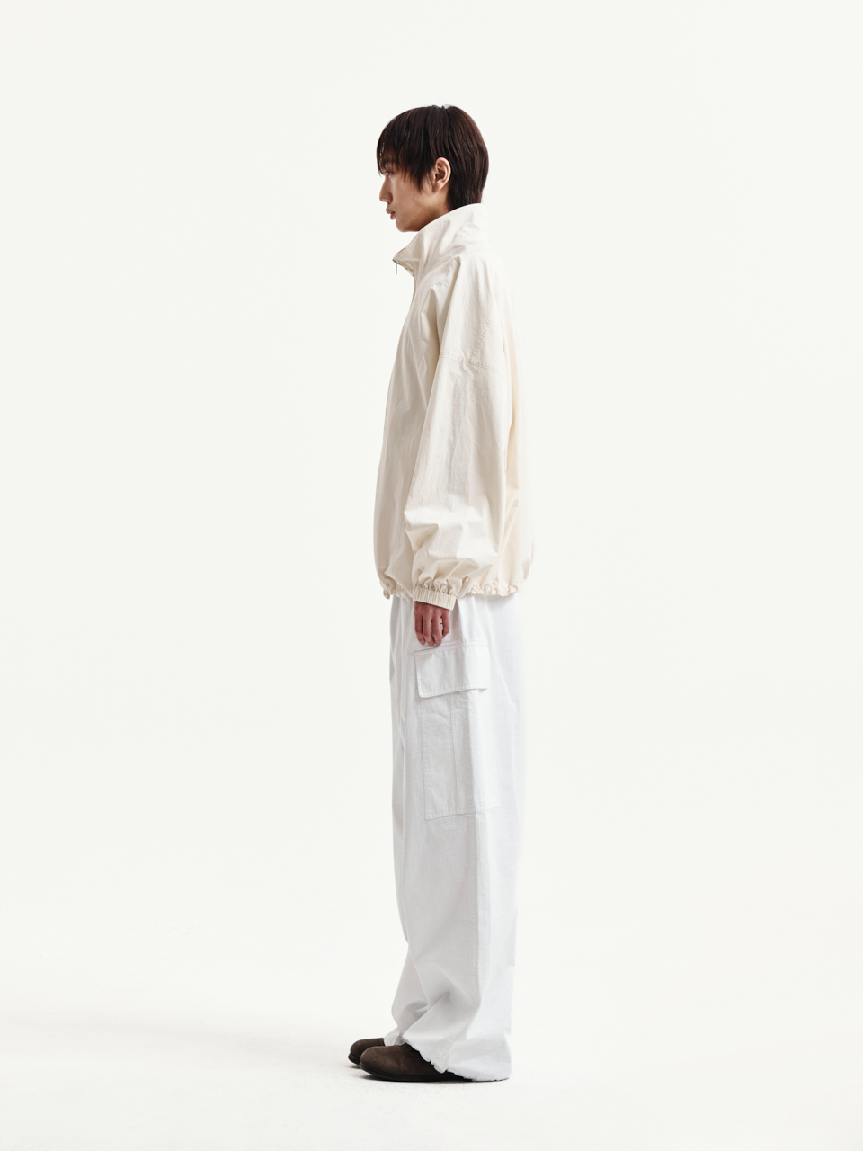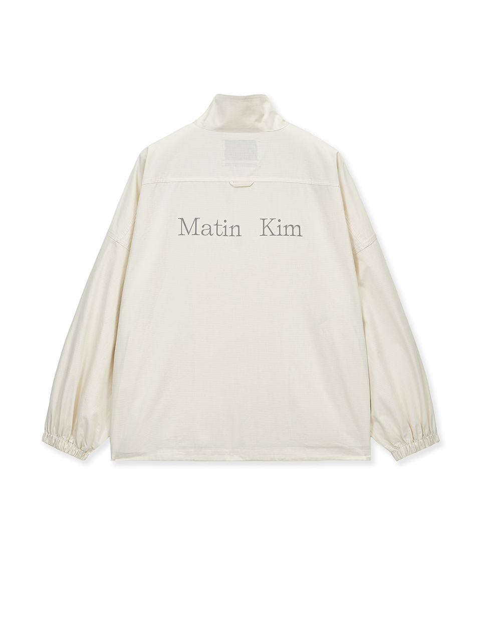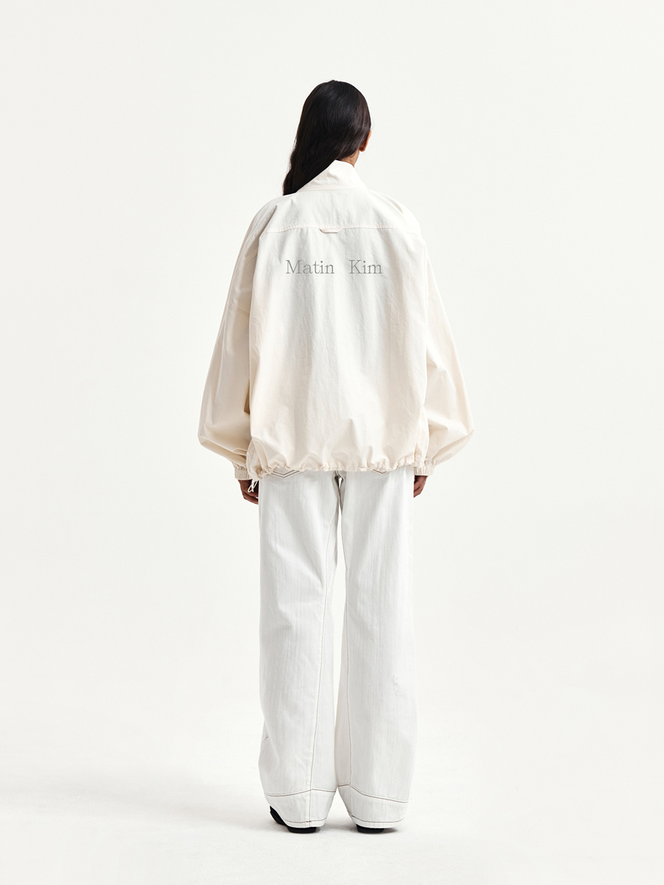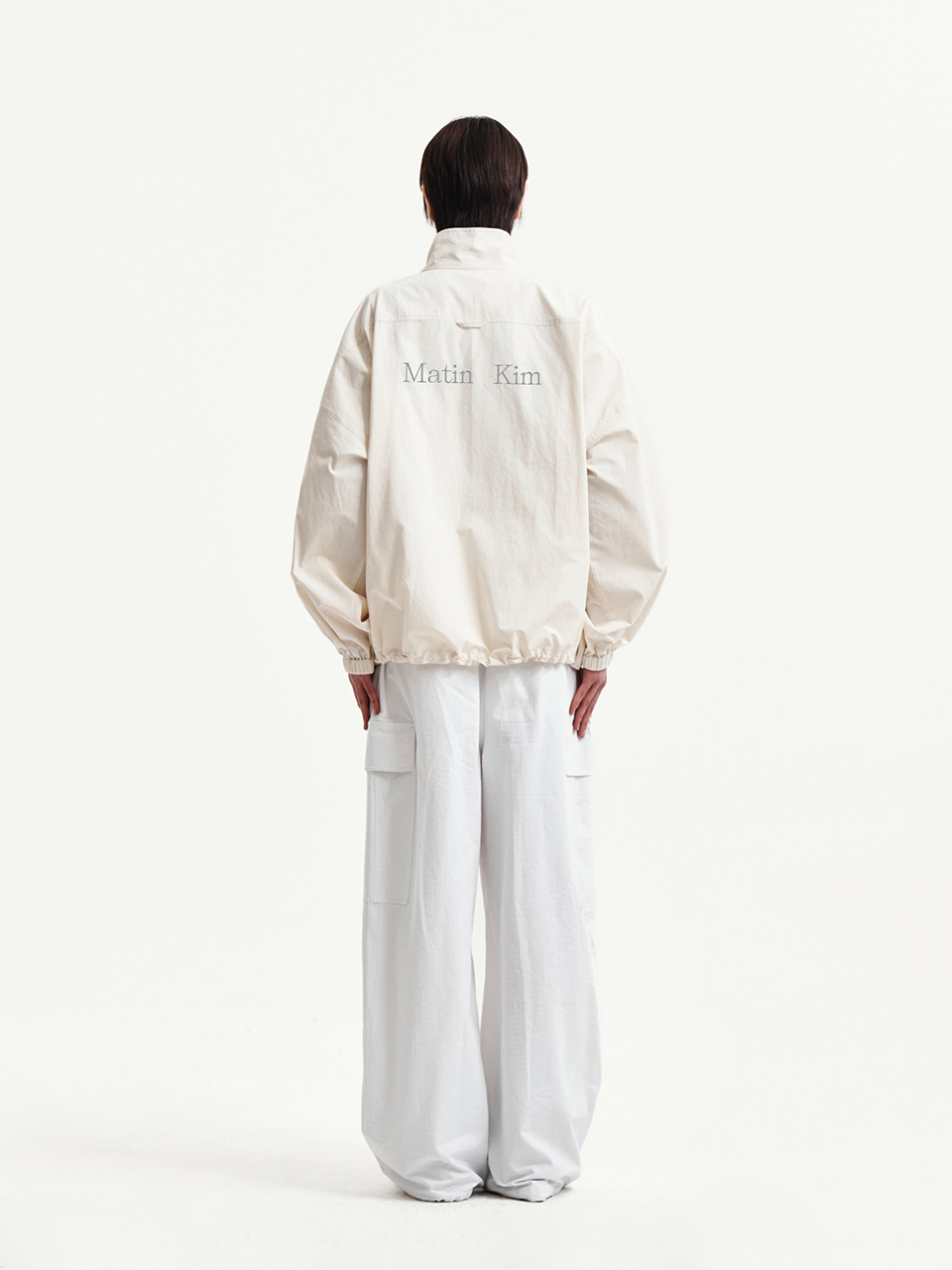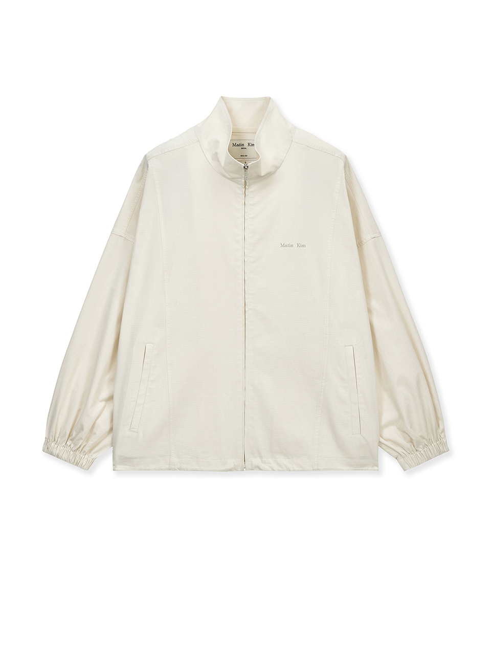 A high-neck oversized zip-up made from soft cotton, featuring logo accents on the front and back panels.