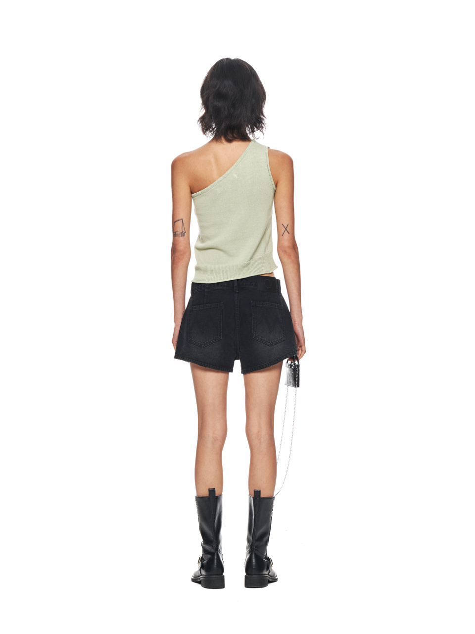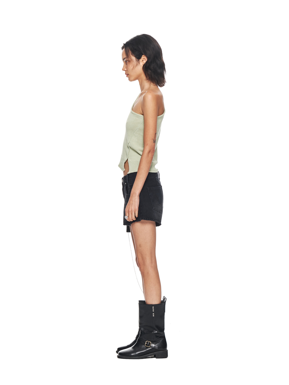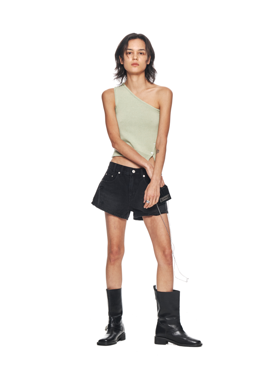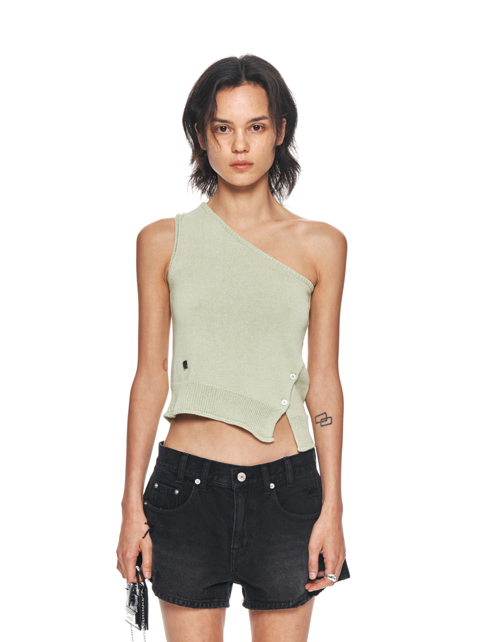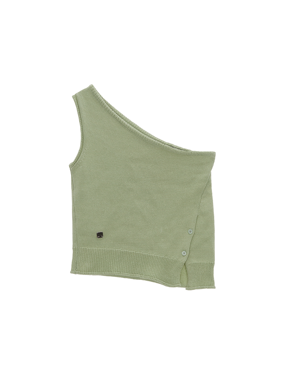 SIDE BUTTON ONE SHOULDER KNIT TOP IN LIGHT GREEN