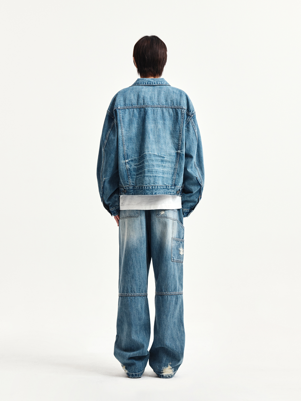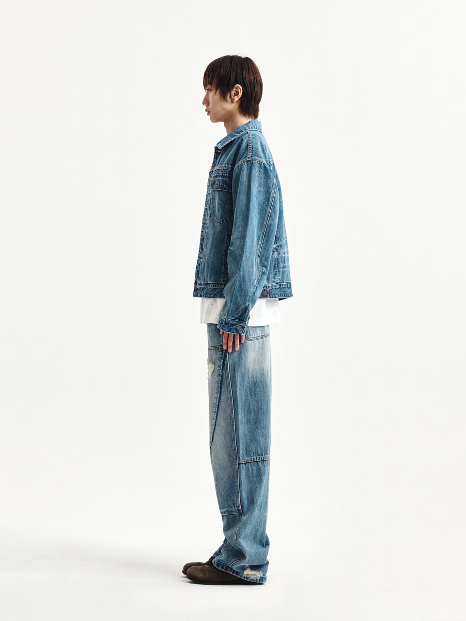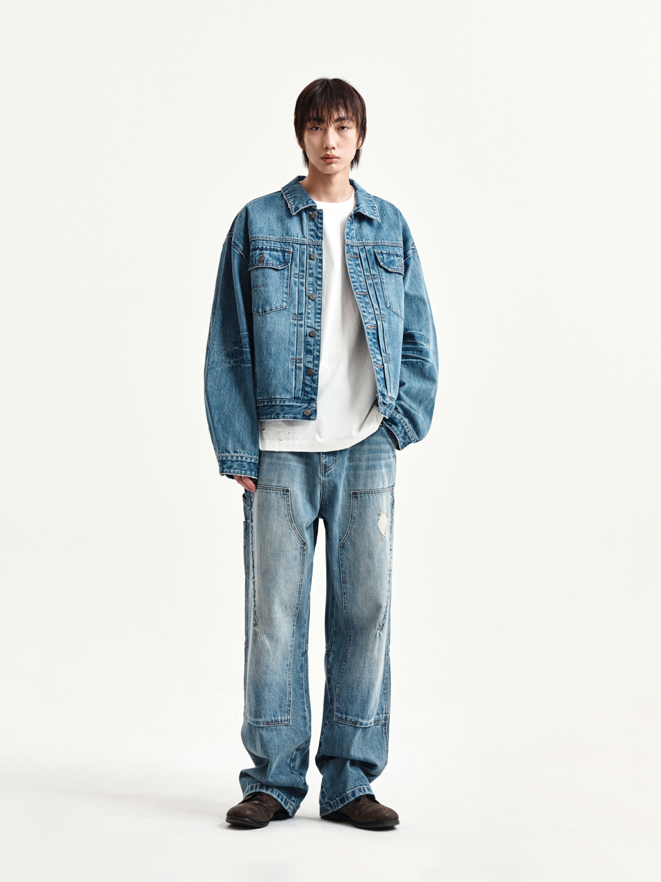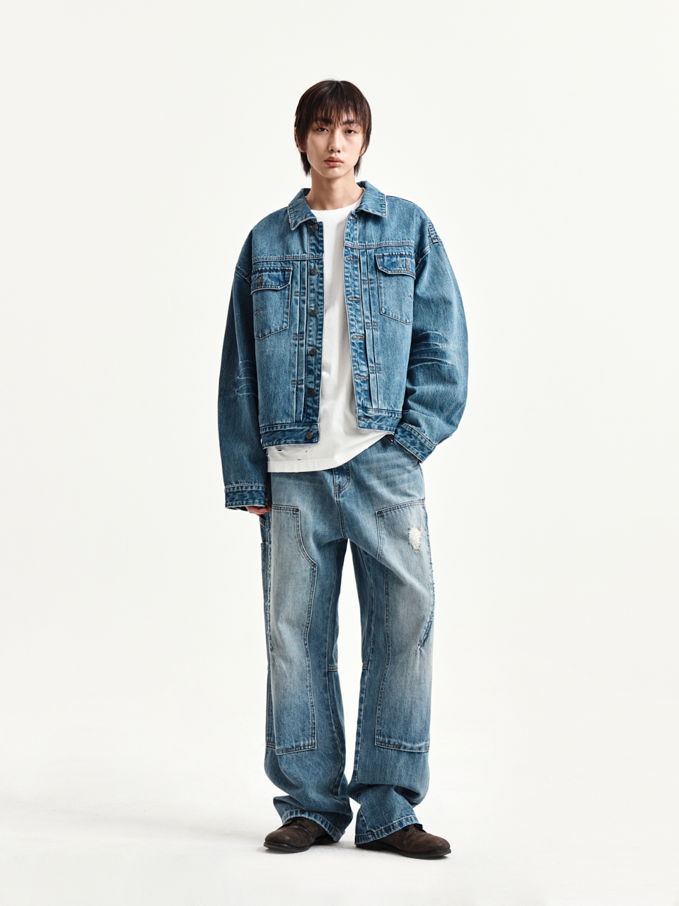 A trucker jacket with a dirty-wash treatment to emphasize a vintage mood.